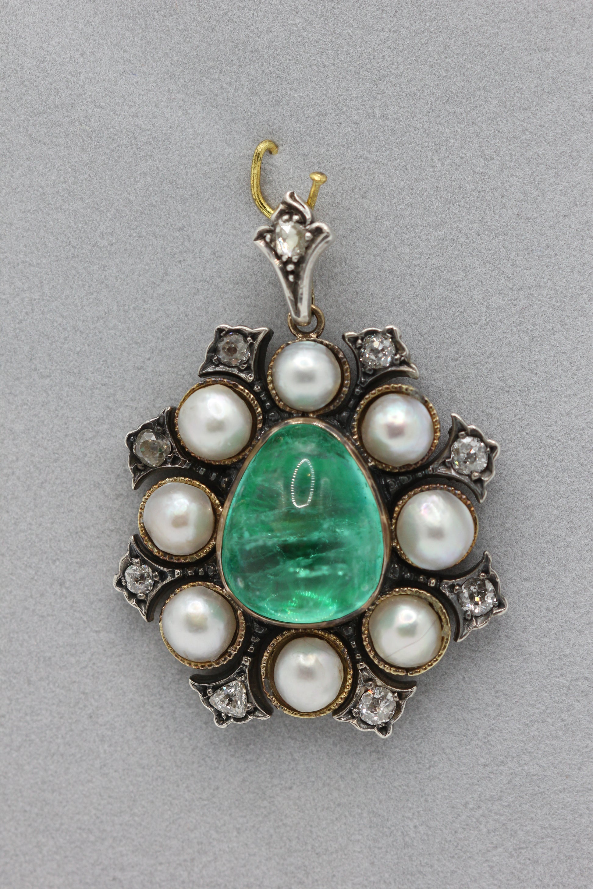 A NATURAL SALTWATER PEARL, EMERALD AND DIAMOND PENDANT in yellow gold and silver, set with a pear shaped cabochon emerald of approximately 12.18 carats, in a cluster of pearls, accented by old cut diamonds, the bail set with a further rose cut diamond, no assay marks, 4.6cm, 15.3g. Accompanied by a gemmological report stating that the pearls are of natural saltwater origin with no indication of treatment.