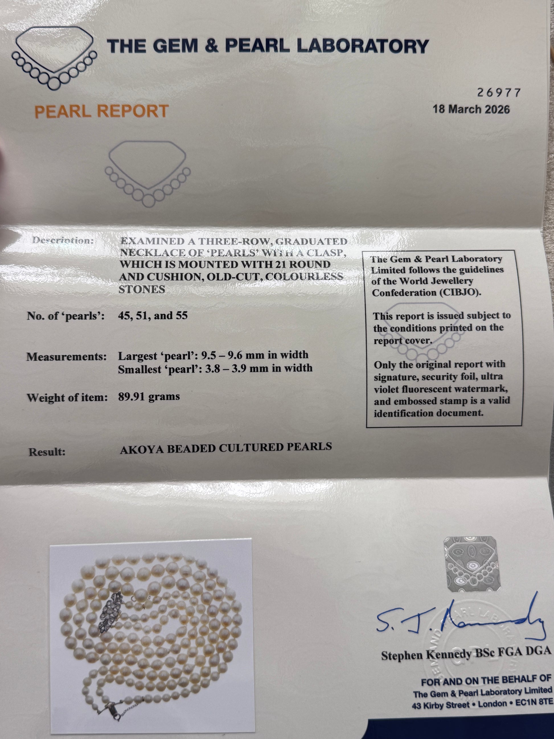 A three row necklace of graduated cultured pearls on a gold backed (tested 18k) and silver clasp with diamonds, unmarked, length of shortest strand 38cm, bead diameter 4.5-9.5mm. Certificate stated Akoya beaded pearls.