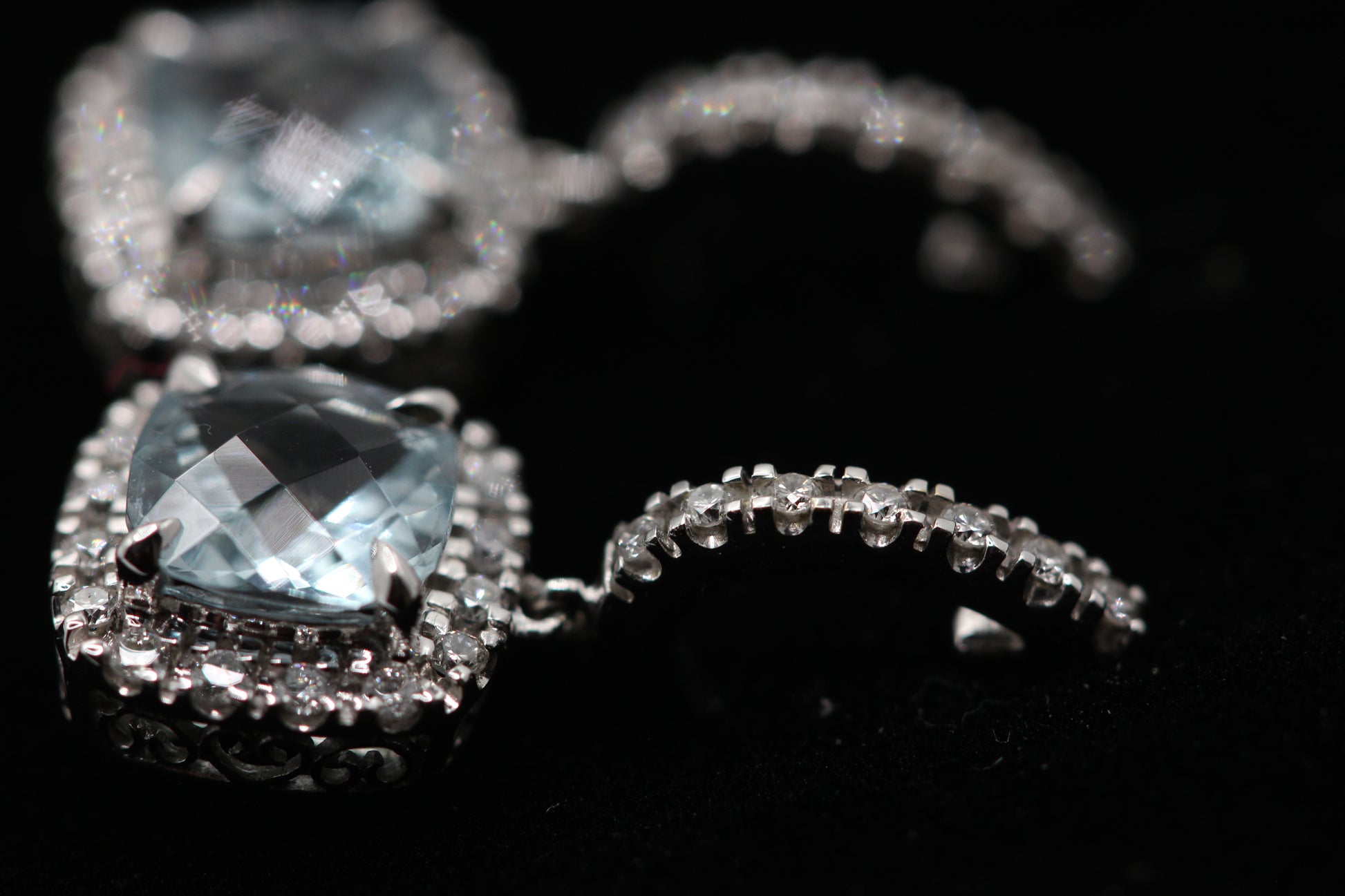 A pair of aquamarine and diamond earrings, each of pendant design, set with cushion-shaped aquamarines with chequerboard tables and brilliant-cut diamonds totalling approximately 0.90 carats, length 2.4cm, combined gross weight 6.2g