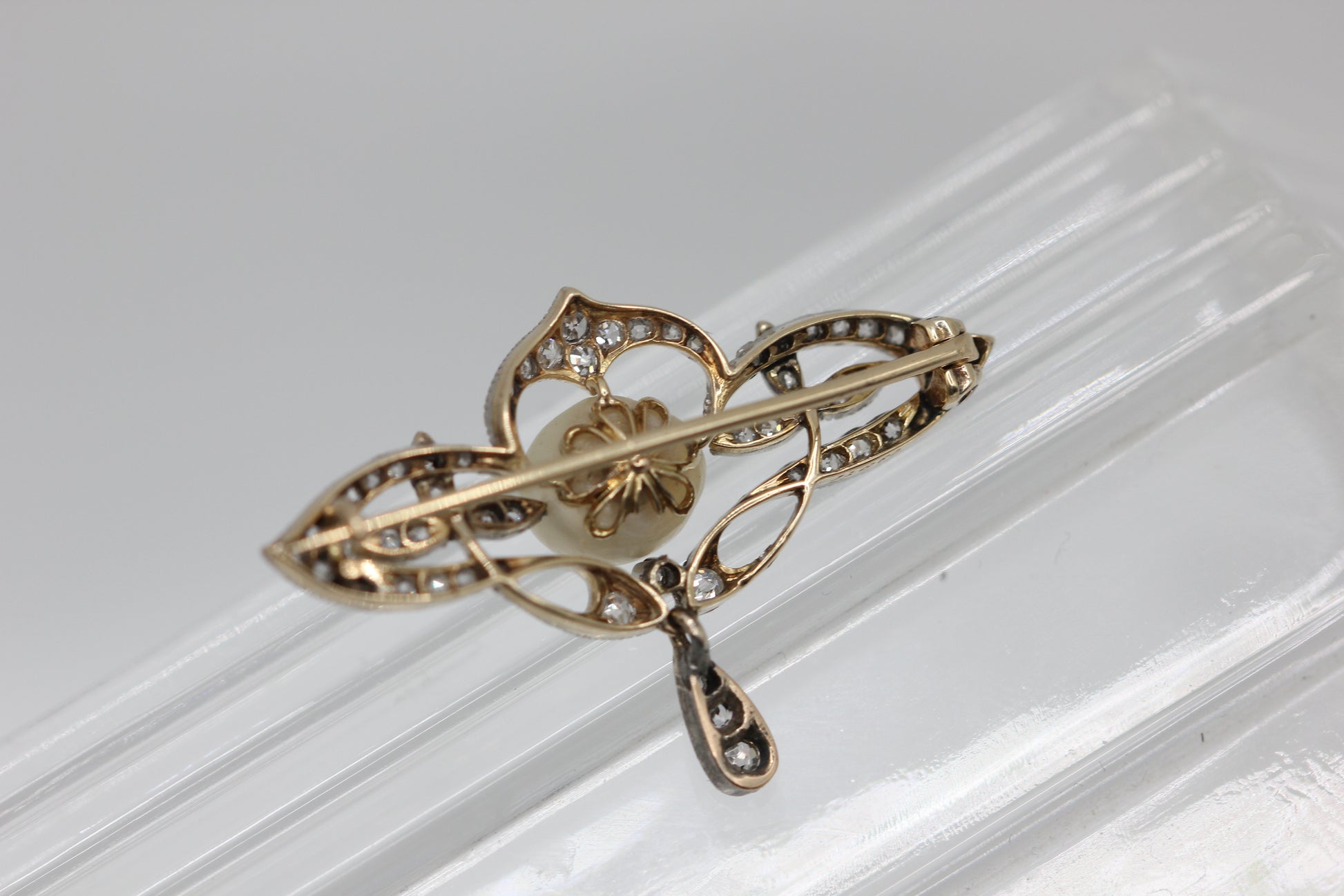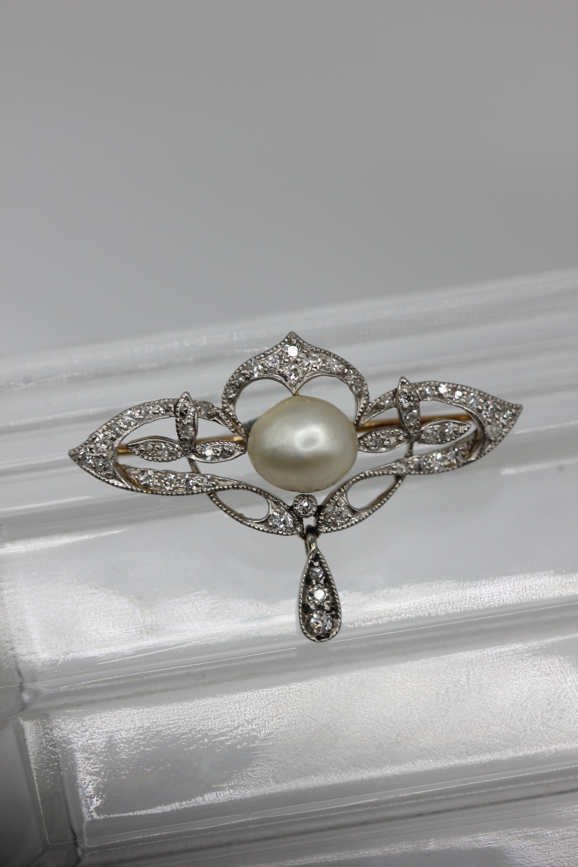An Art Nouveau pearl and diamond brooch, of whiplash floral design, featuring an egg-shaped pearl of 8.3 x 7.4 mm, mounted to an openwork mount with millgrained edge fully set with single-cut diamonds, further suspending a later-added drop, brooch fittings to the reverse, unmarked metal testing as platinum on 14ct, drop testing as silver, 3.6 x 2.5 cm, 4.2 grams.