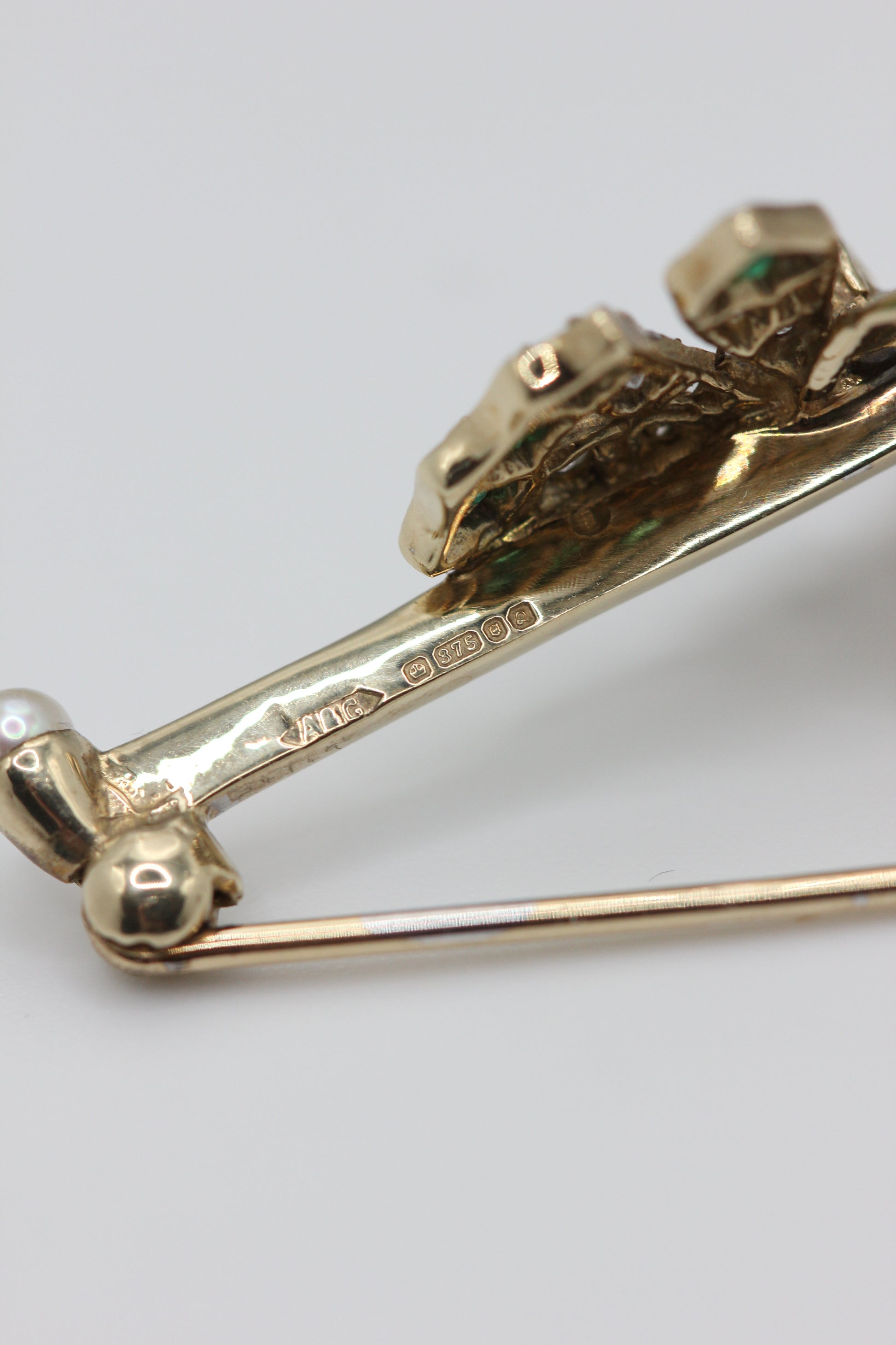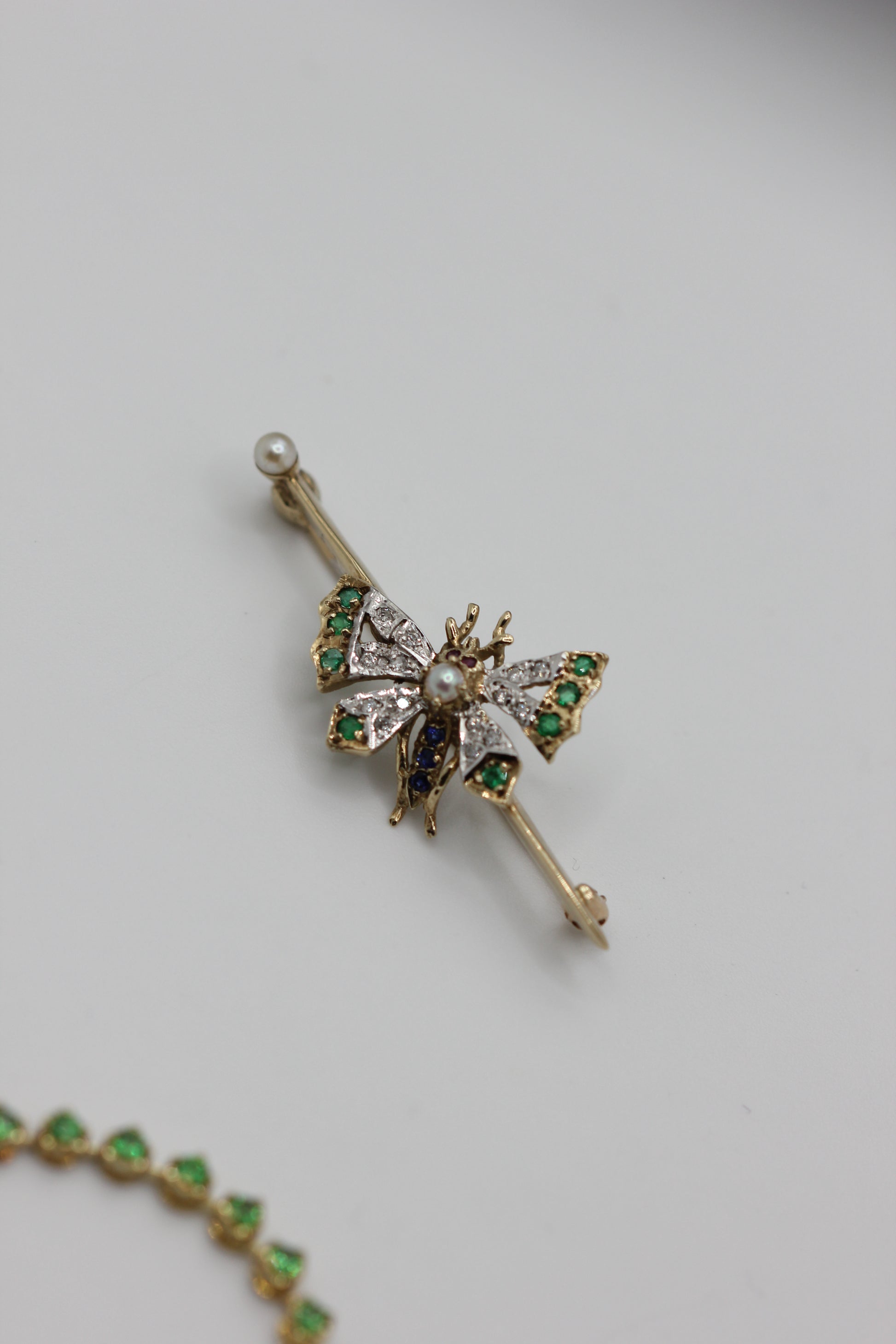 A 9ct gold diamond, multigem and pearl bar brooch, in the form of a butterfly resting upon a bar, centred with a pearl, and set throughout with round brilliant cut diamonds, emeralds and sapphires, with ruby eyes and a split pearl to one end of the bar, to pin and roller catch, 46mm x 20mm, London 1990, 4.83g