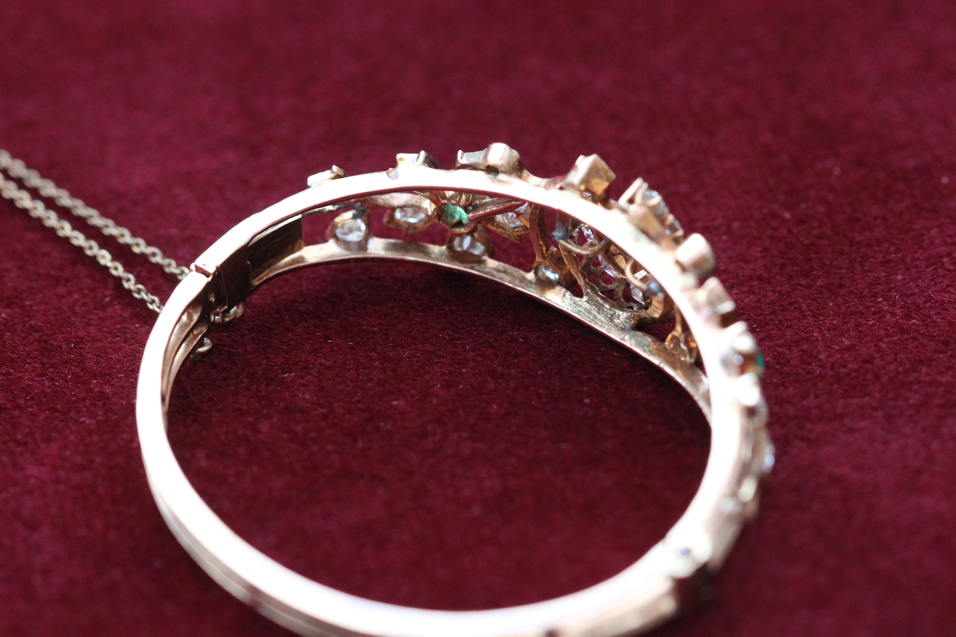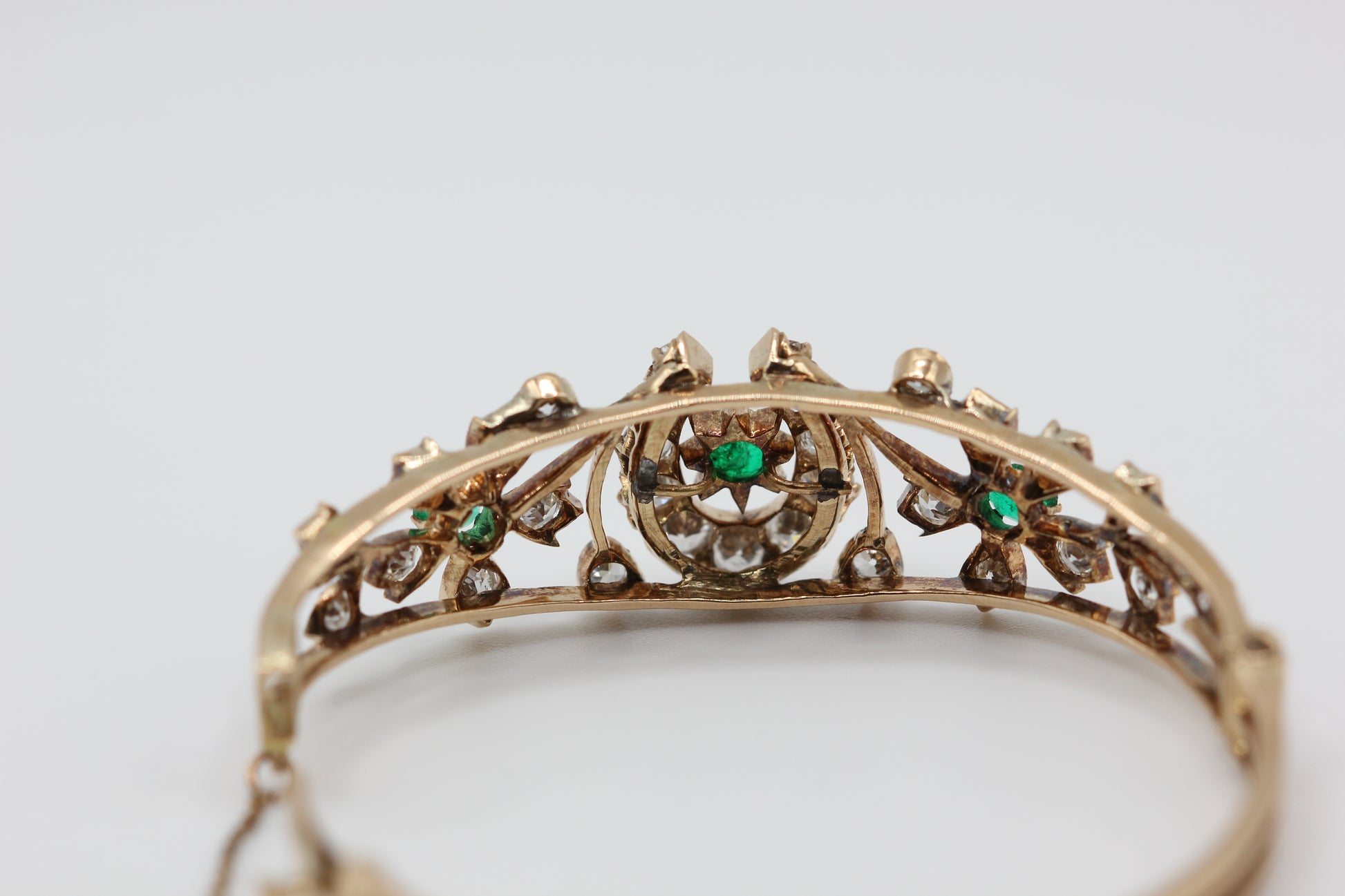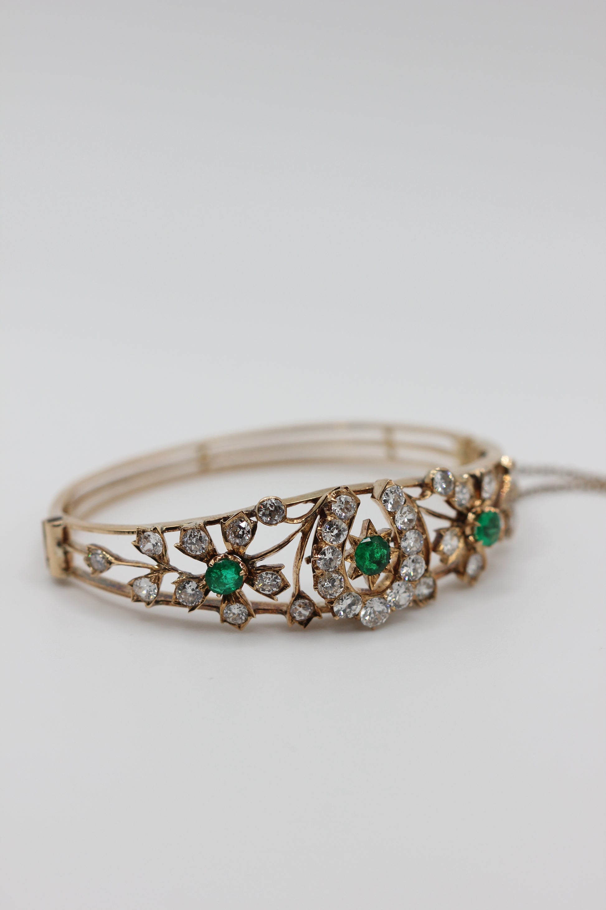 An emerald and diamond bangle, of hinged oval trifurcated form, applied to the front with a tapered frieze of flowerheads and foliage enclosing a horseshoe, set throughout with graduated old and old brilliant-cut diamonds and circular mixed-cut emeralds, yellow precious metal mounted tested as 18k gold, total diamond weight approximately 1.40ct, should fit a wrist not more than 14cm in diameter. Weight 13gms