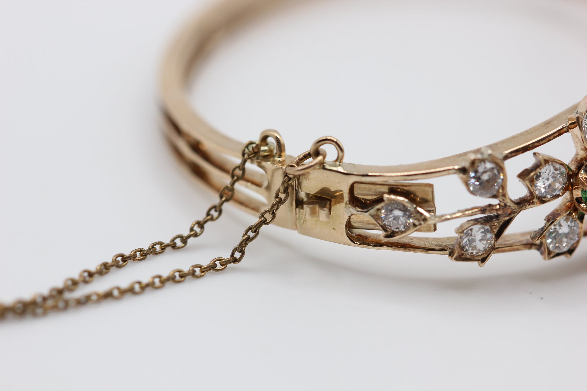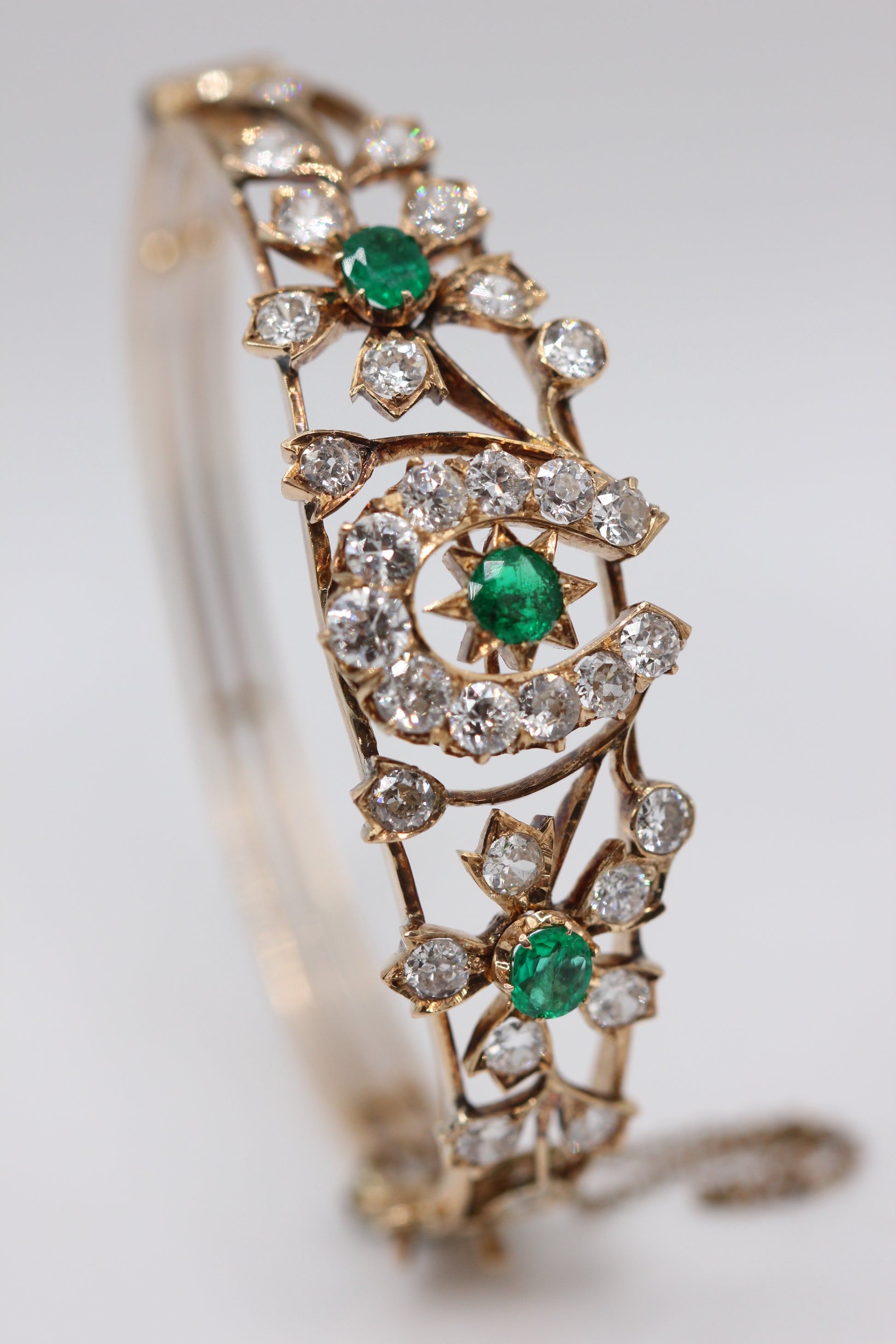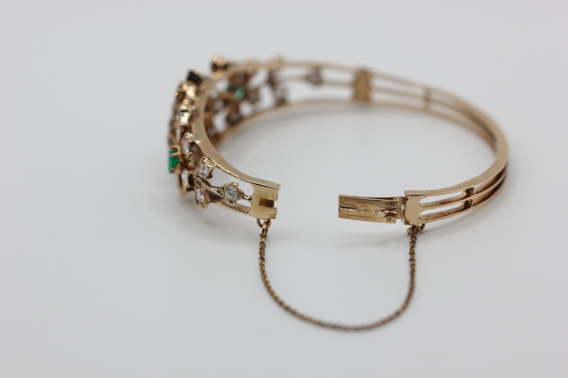 An emerald and diamond bangle, of hinged oval trifurcated form, applied to the front with a tapered frieze of flowerheads and foliage enclosing a horseshoe, set throughout with graduated old and old brilliant-cut diamonds and circular mixed-cut emeralds, yellow precious metal mounted tested as 18k gold, total diamond weight approximately 1.40ct, should fit a wrist not more than 14cm in diameter. Weight 13gms