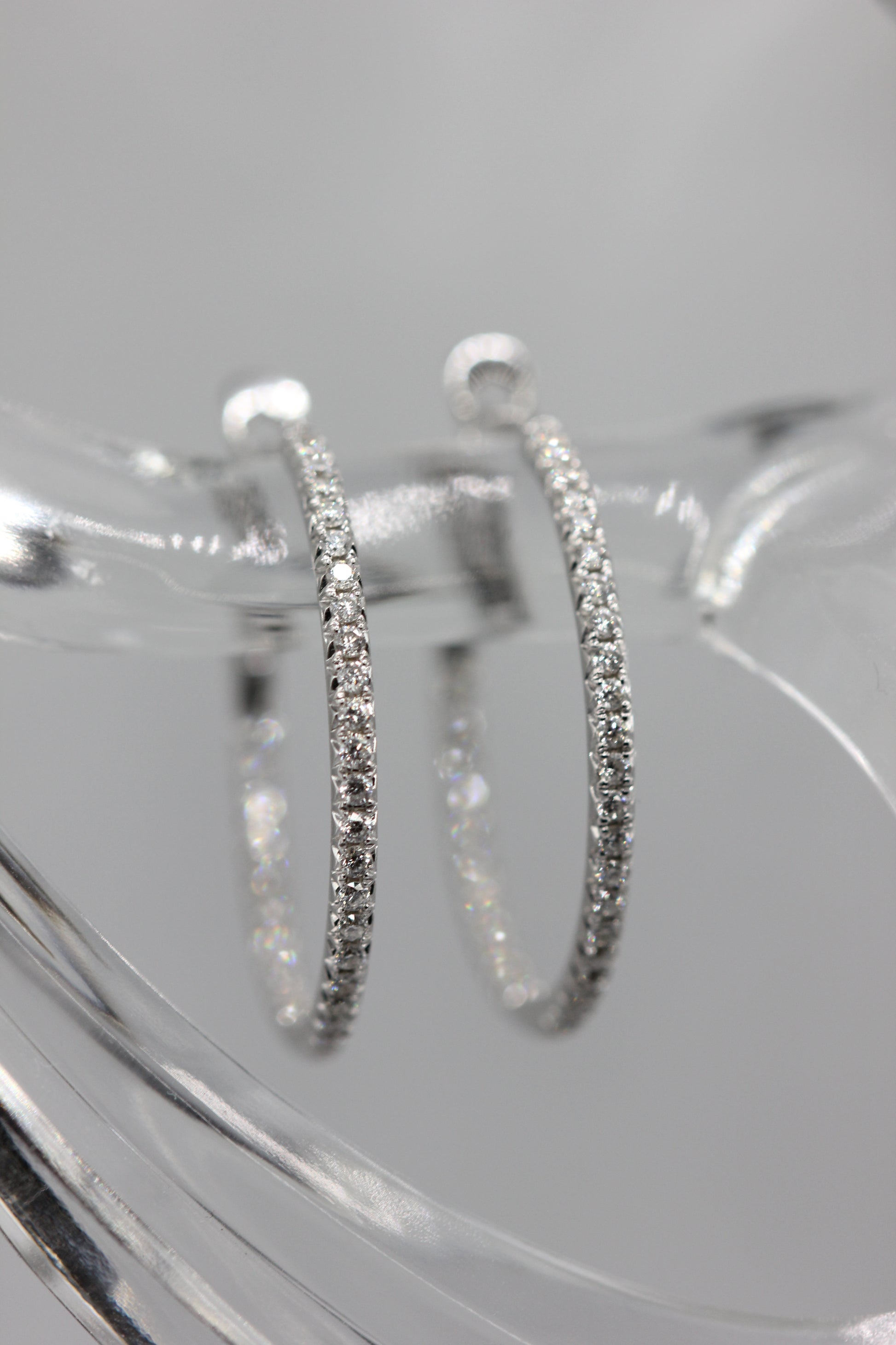 A pair of 18ct white gold diamond-set hoop earrings, each comprising twenty-three round brilliant-cut diamonds to the front of the hoop and thirteen round brilliant-cut diamonds to the inside of the back half of the hoop, each earring completed with a post and hinged clasp fitting, in 18ct white gold, hoop drop approximately 24mm, 4.30 grams.