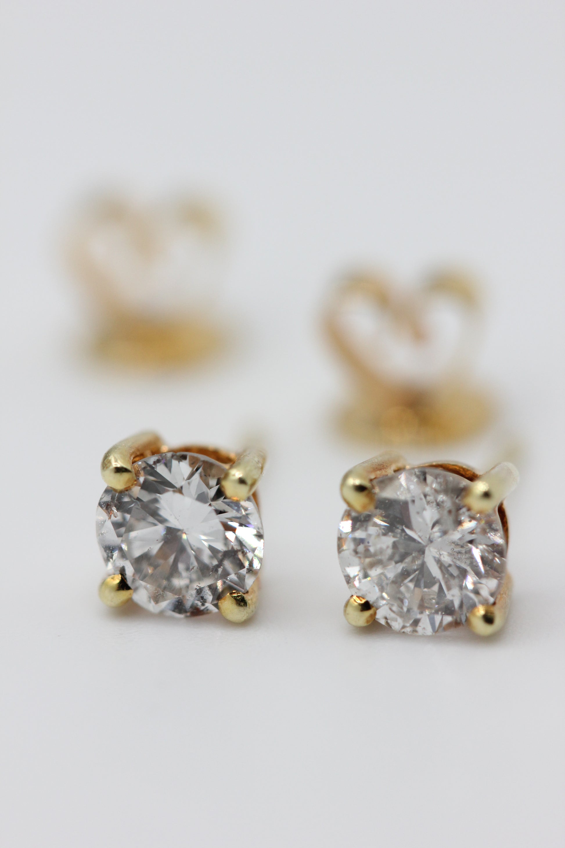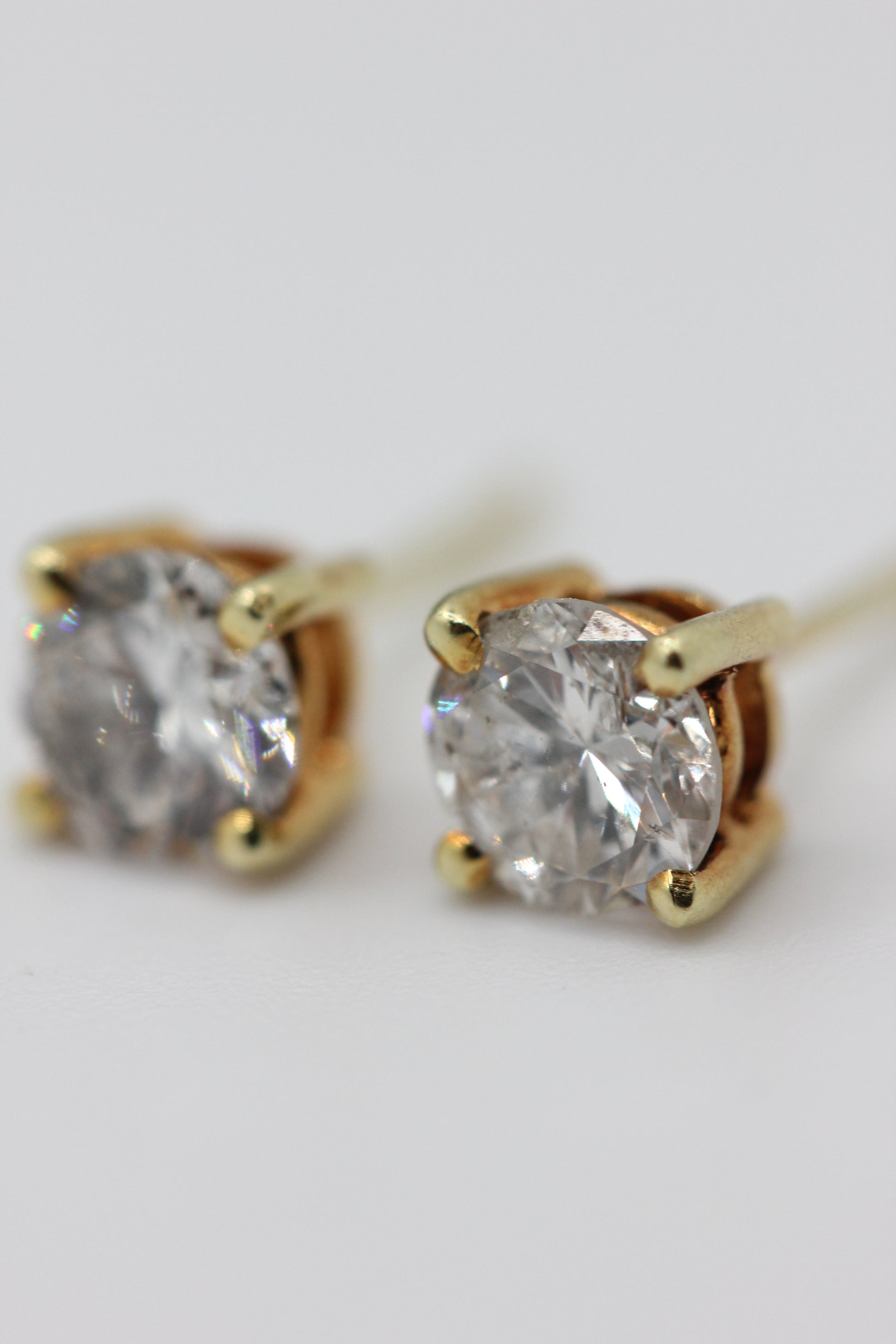 A pair of diamond single stone earrings, the round brilliant cut diamonds in simple four claw mounts to post fittings. Diamonds estimated to be 0.80 carats each (approximately 6mm in diameter). Colour estimated to be I/J/K/ and clarity I1/2. Gold tests 18k, hallmarked on backs 585.