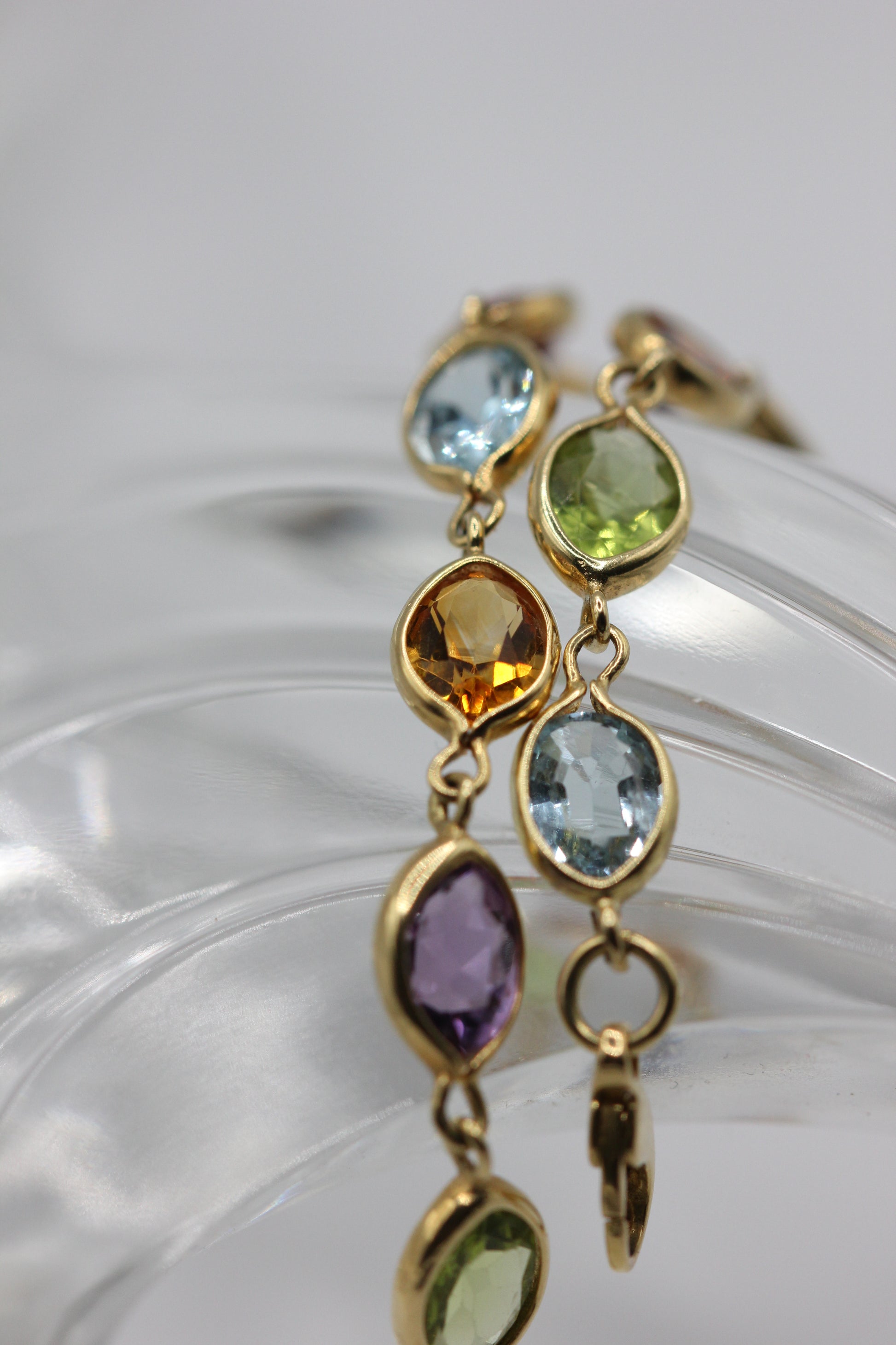 A gold and gem set bracelet, composed of oval amethsyts, peridots, citrines and topazes, in 18ct gold (tested) spectacle settings, length 21cm, gross weight 9 grams.