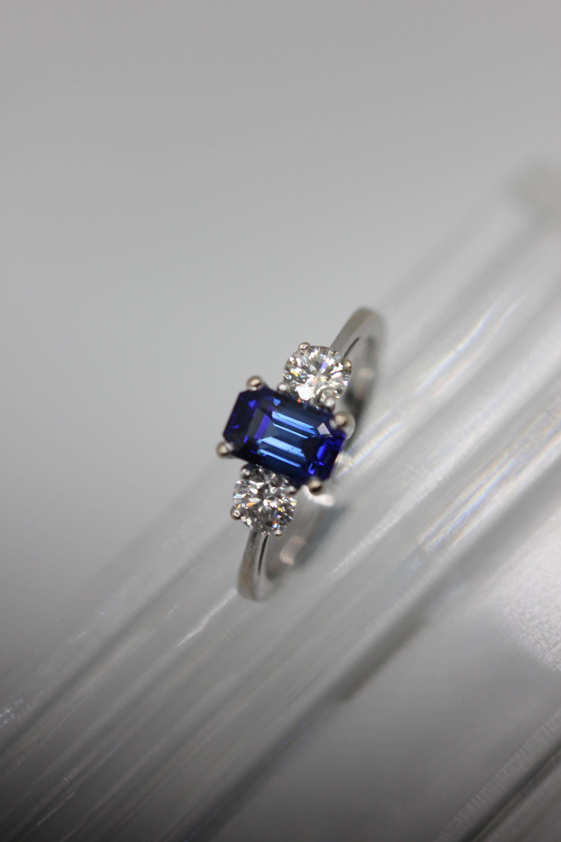 A sapphire and diamond three-stone ring in 18ct white gold, centred with a rectangular step-cut sapphire with canted corners, measuring 6.8 x 4.4 x 3.9 mm, set between round brilliant-cut diamonds with an estimated total weight of 0.40ct, between tapered shoulders, British assay marks, size J, 2.7 grams.
