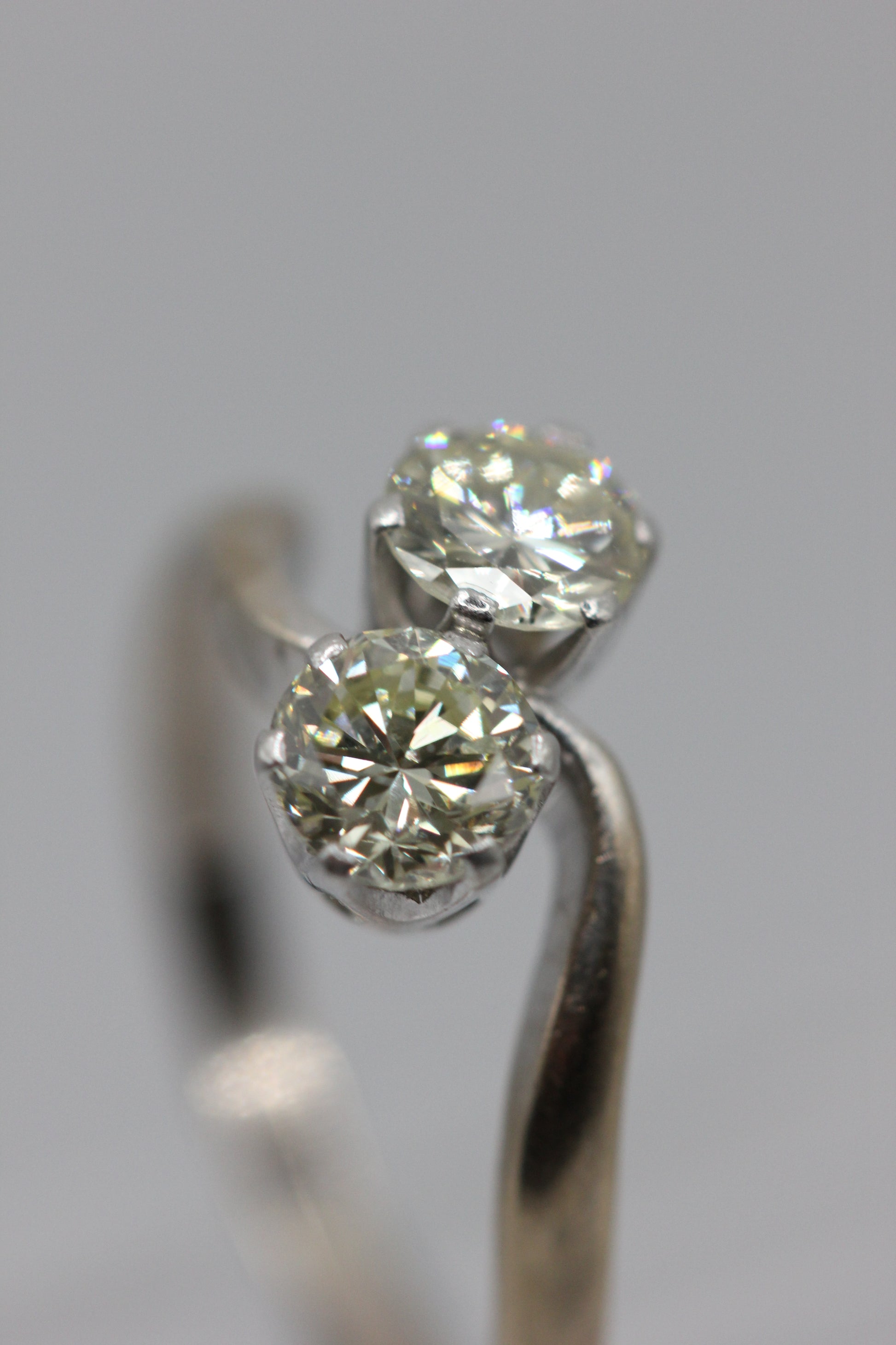 An 18ct white gold two stone diamond crossover ring, maker EF Ltd, Sheffield, claw set with round brilliant-cut diamonds, each weighing approx 0.5ct, total diamond content approx 1ct, colour approx K-tinted, setting height 9.6mm, size N1/2, 3.2g, marked 750